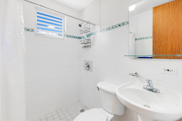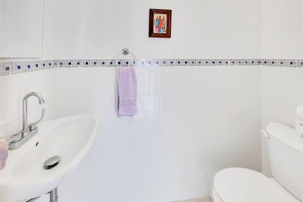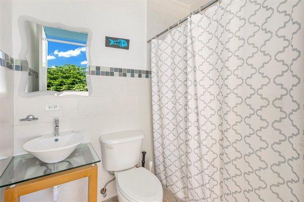 There is also a modern, tiled ½ bathroom on the 1st floor with toilet and sink and mirror.