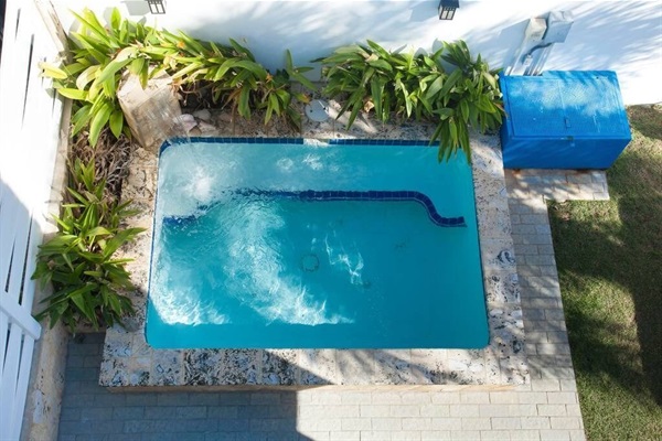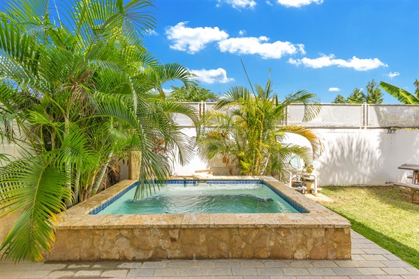 The ground floor living space has leather sofas and leather easy chair, a flat-screen TV, coffee table, and sunny windows. From the living area, sliding glass doors open to the patio with dipping pool and picnic table. Kids and adults will love to cool off and play in the private dipping pool, which is crystal clear. The patio and dipping pool are yours alone, and the entire backyard area is fenced in.