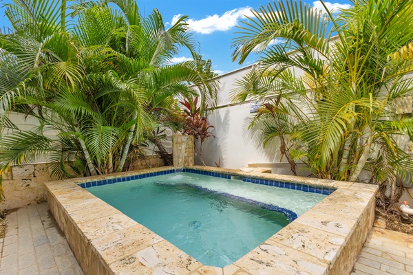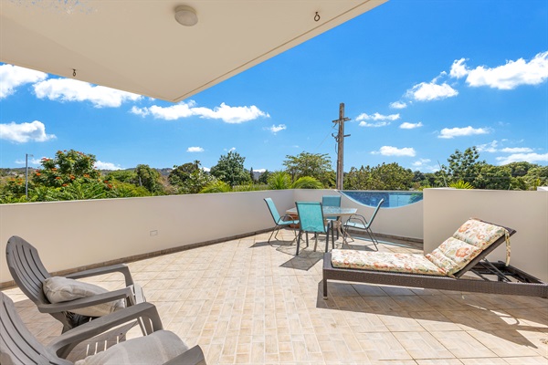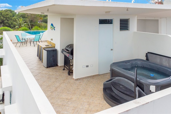 Our gorgeous roof-top terrace has a private jacuzzi, gas grill, mini-fridge, table and chairs, lounge chairs, another bathroom, and ocean views. Great place for breakfast, an adult beverage, BBQ, or star gazing from the hot-tub.