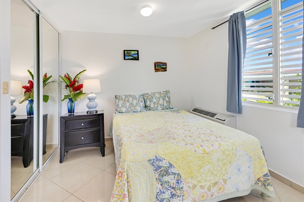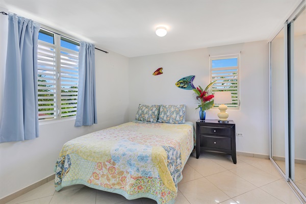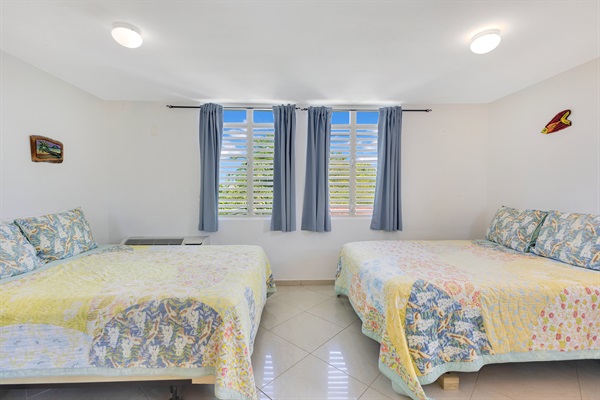 The second large bedroom has 2 queen beds, bedside tables and lamps, 2 closets, cool local art, and another full modern tiled bathroom, right beside it.
